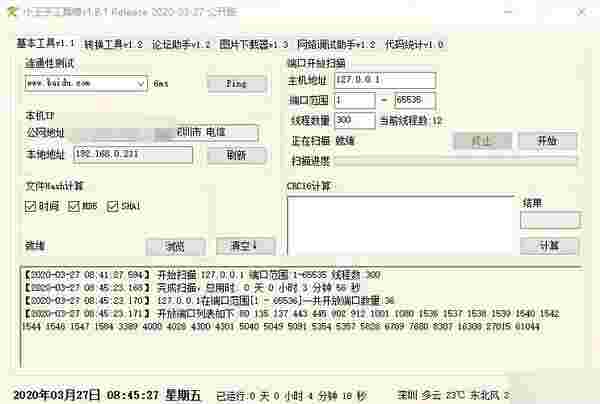 基本工具,包括ping测试,获取本机ip和公网ip,文件md5计算,crc16计算,端口开放扫描