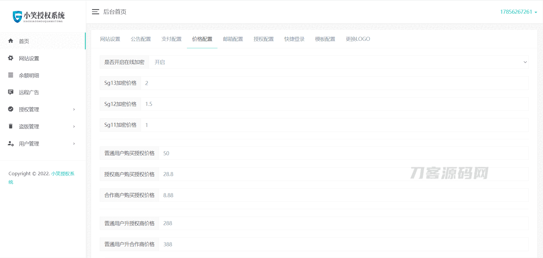 5、密价功能,每个用户可设置不同的授权价格(全网授权系统首发功能)