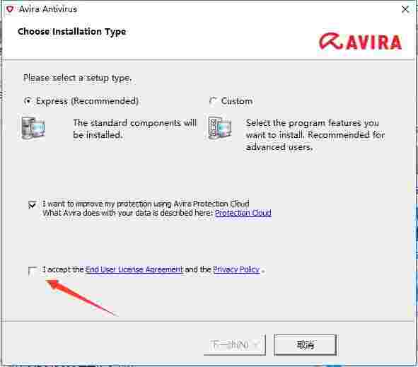 3、勾选红色箭头处的接受条款选项,点击下一步。
