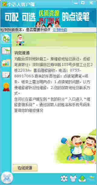 自制有声教材,锻炼能力,充实孩子的业余生活;利用小达人配套的客户端可随心所欲自制有声教材,既给了孩子一个锻炼能力、凸显性格优势的平台,又可以让孩子充分享受创作的快乐,从而寻找到最适合自己的学习方式。