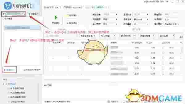打开小鹿竞价百度版后,需要绑定百度推广账户后才能继续使用,首先点击左上方logo下的请选择账户下拉框,弹出账户管理面板,用户在此管理自己的推广账户,可以新增账户、切换账户、删除账户等操作,对于首次使用小鹿竞价百度版的用户请点击新增账户按钮,绑定需要调价的百度推广账户。