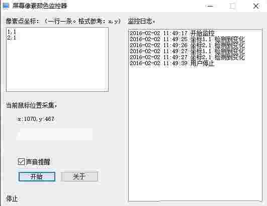 屏幕像素颜色监控器是一款专业的屏幕像素监测的工具软件。软件可以指定任意位置的屏幕像素点的颜色对其监测变化,十分方便快捷,界面简约,布局直观清晰,操作简单,极易上手,是一款不可多得的利器。