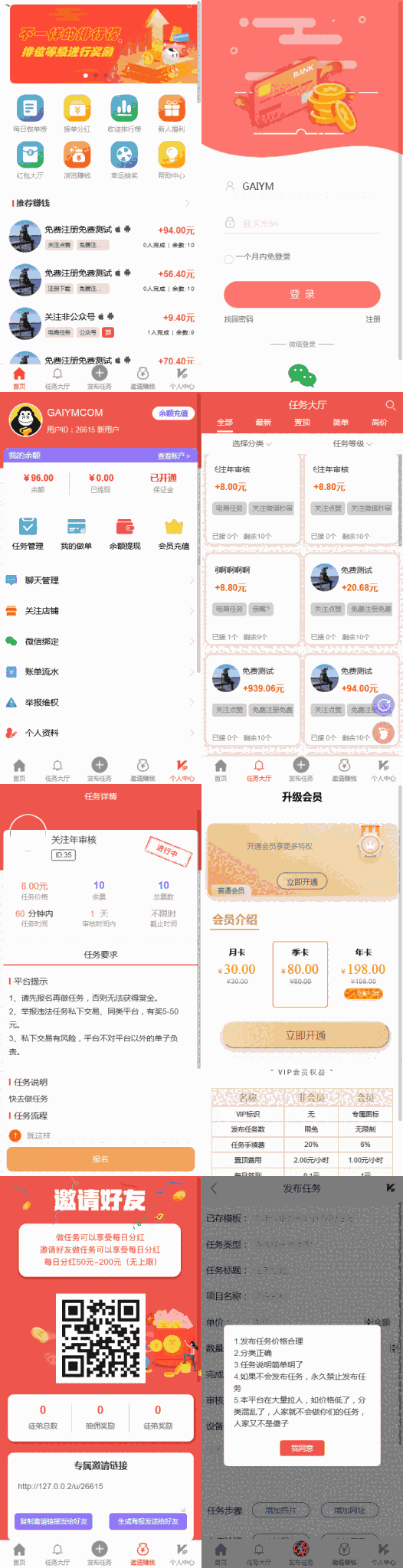 开发悬赏任务兼职系统,仿蚂蚁帮扶众人帮平台,功能齐全,包含接任务,发布任务,店铺关注,置顶推荐,排行榜,新人福利,红包大厅,红包抽奖,任务步骤,微信绑定,分销推广,举报维权,vip会员特权等众多功能,已有客户上线运营,支持微信绑定登陆。