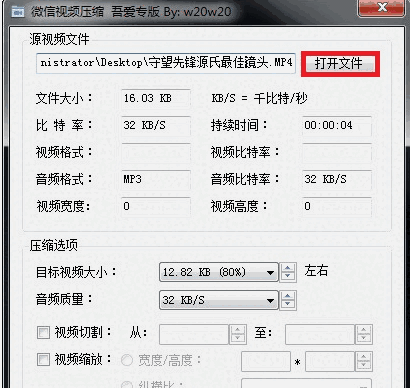 用法很简单,点击“打开文件”按钮选择一个视频文件,然后设置所需的压缩视频大小,最后点击“压缩”按钮开始视频压缩。