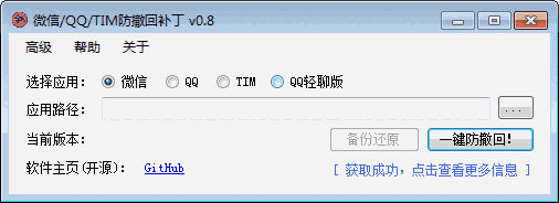 程序自带的补丁信息并不是最新的,需要动态从网上获取最新补丁信息。请耐心等待右下角获取补丁信息的提示变成“获取成功”,点击这行字可以查看当前支持防撤回的版本信息,如果其中显示支持你当前需要防撤回的版本。可以提Issue给我