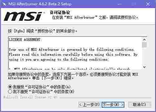 2、阅读MSI Afterburner许可证协议,点击“我接受许可证协议中的条款”,点击“下一步”继续。