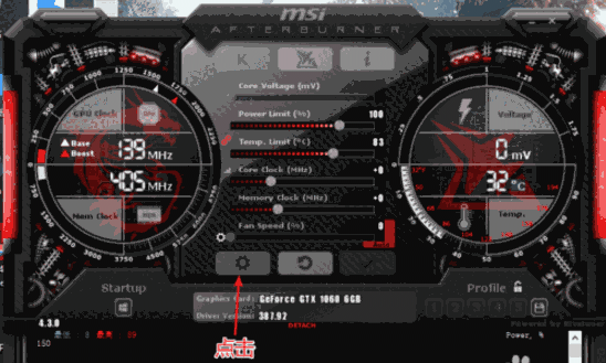 1、打开微星显卡超频工具软件,点击齿轮形状的设置按钮。