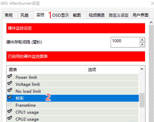 2、点击监控,在“已启用的硬件监控图表”点击你想监控的项目,以帧率为例,使帧率项变成高亮的蓝色,在“在OSD上显示”前的方框打勾。