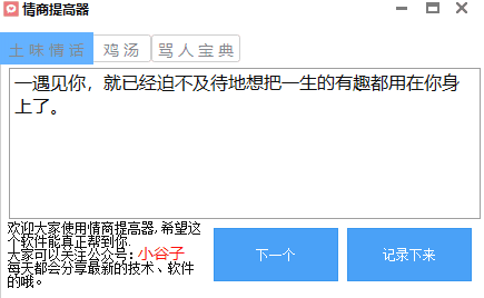 情商提高器是一款专业的聊天辅助的软件工具,软件提供了土味情话、鸡汤话术、骂人话术,让你在聊天的时候找到合适的话语。非常方便快捷,软件界面简约,布局直观清晰。操作简单,容易上手,是一款十分实用的工具。