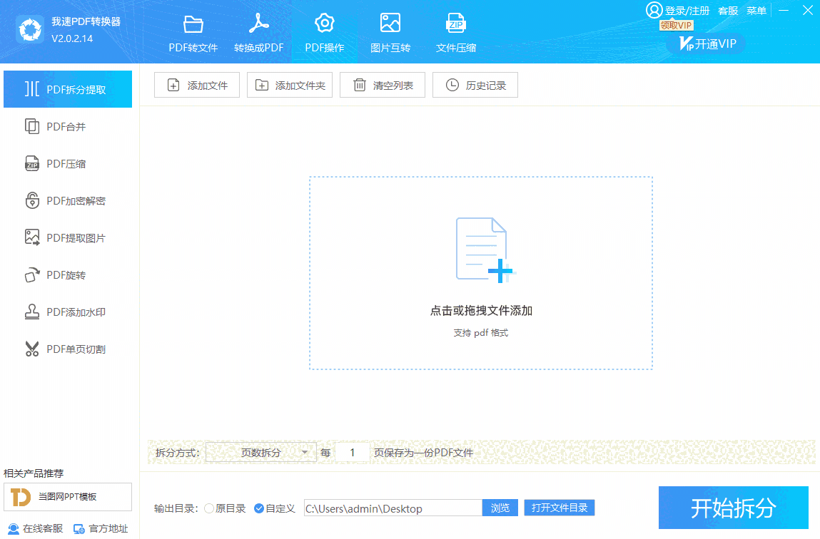 支持PDF、Word、PPT、Excel、图片、TXT、html文件的批量互转,新增PDF合并、压缩、拆分、页面提取功能