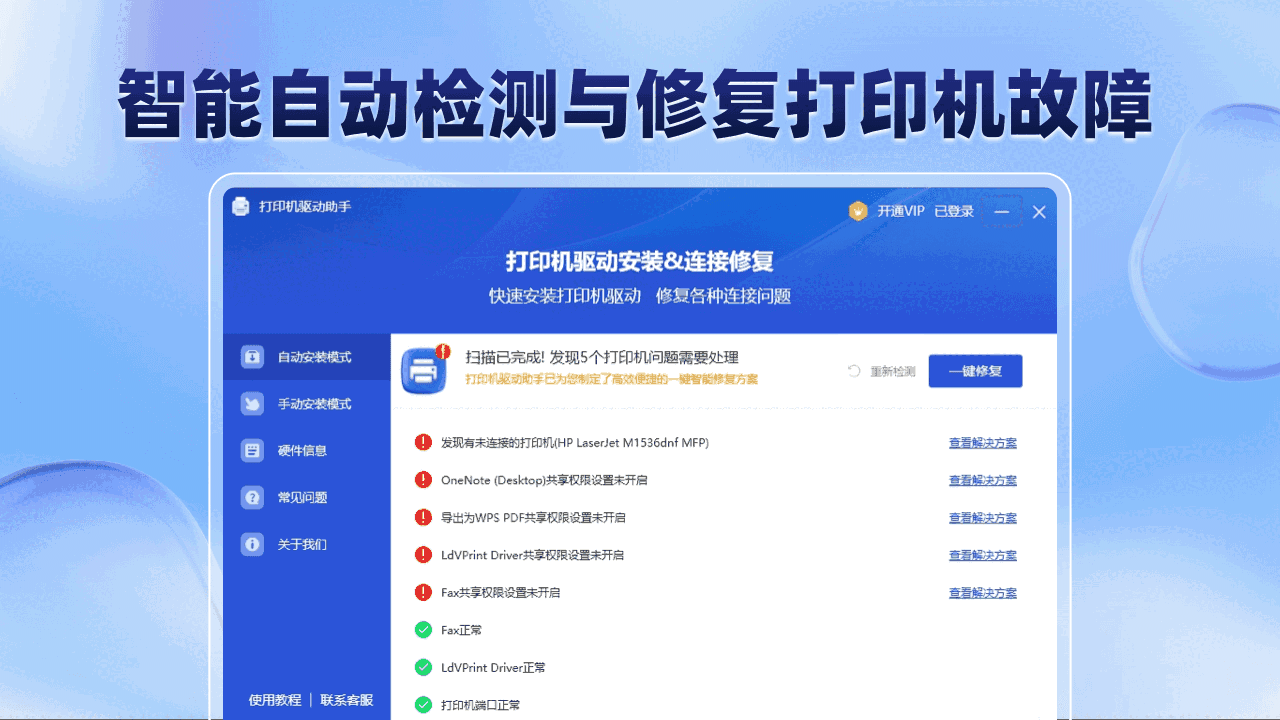 打印机驱动助手是一款功能强大的打印机驱动软件,软件拥有快速修复、硬件检测、打印机故障大全等功能,可以自动识别打印机型号,快速匹配下载对应的驱动程序,提供最简单、最可靠的解决方案,以确保您的打印机始终正常工作,还可以修复由打印机驱动损坏或缺失引起的打印机无法正常使用等问题,感兴趣的赶快下载使用吧!