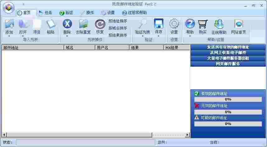 托托邮件地址验证工具是一款用于批量检测邮件地址列表有效性的软件,通过三重验证机制使验证结果有效率达97%以上,是目前网络上较出色的邮件地址验证工具。