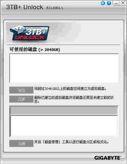技嘉3TB+Unlock最新版是款很优秀且功能较为丰富的硬盘工具,技嘉3TB+Unlock电脑版能够把3TB硬盘上32位系统无法识别的容量创建成一个虚拟磁盘,容量最大限制为2048GB(2TB)。软件现在支持技嘉的IntelX58、P67、H67、H61、B65,AMD890FX、890GX、880G等芯片组主板产品,具体型号有六十款之多,而且技嘉表示对更老芯片组主板的支持也正在移植中,最终会完全支持所有正在销售的产品。
