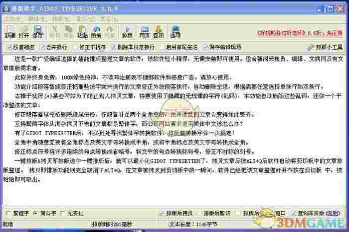 《排版助手(Gidot Typesetter)3.1.1》是一款智能排版整理文章的软件,这款软件适合编辑、文摘网及有文章排版需求者,软件内的功能非常丰富,操作也很简单,是一款非常不错的软件,感兴趣的小伙伴欢迎下载使用噢!