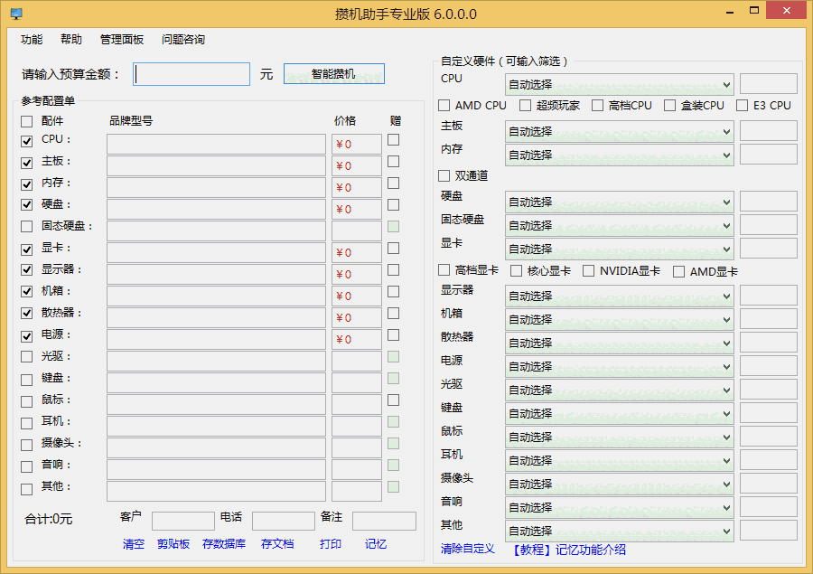前台可设置客户名称、联系电话、备注等信息,方便为客户打印配置单。还可以将配置单保存到数据库存档。