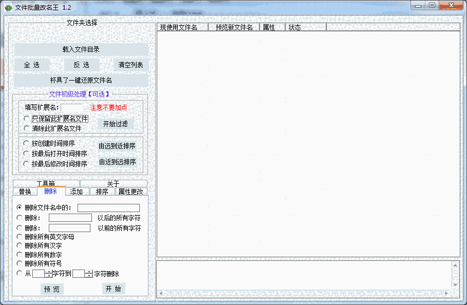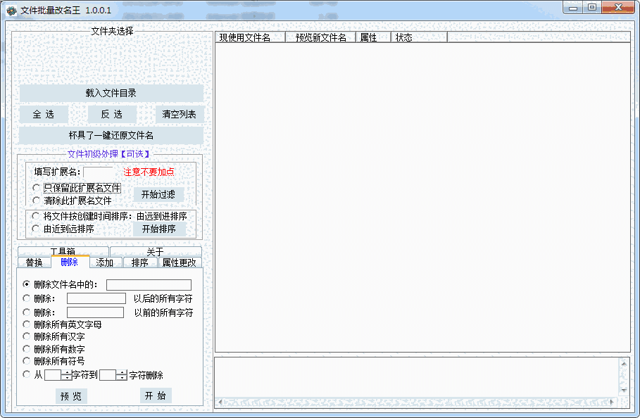 文件名批量修改王是一款专业的文件名批量修改的工具软件。软件可以帮助使用者批量修改文件名包括对文件名进行批量删除内容、批量替换内容、批量添加内容、批量修改扩展名等等功能,软件的界面非常简洁,使用起来也非常方便。