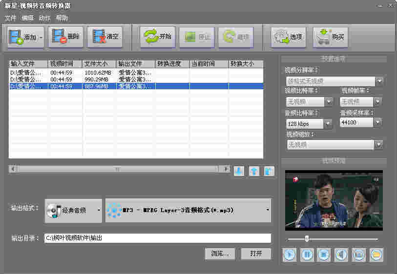 新星视频转音频转换器是一款专业的视频格式转换音频的工具软件,支持视频格式转换为MP3、WMA、WAV、OGG、AAC等不同格式的音频文件。十分方便快捷,界面简约,布局直观清晰,极易上手,是一款不可多得的利器。