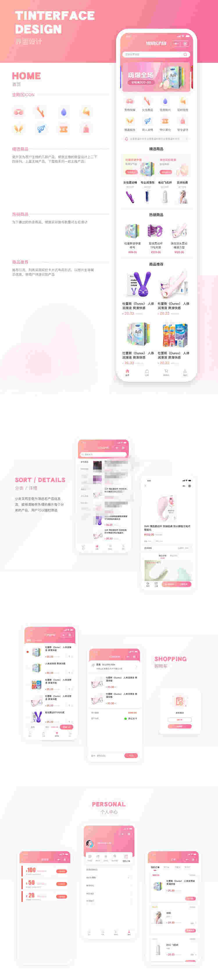 一款成人用品线上零售商城,在线销售男士、女士避孕用品、情趣内衣和玩具类等两性健康产品,客户有自己的货源为了扩大渠道,方便客户购买,开发本款小程序。
