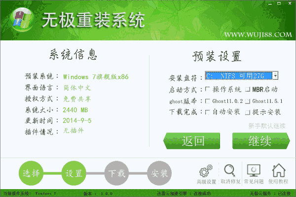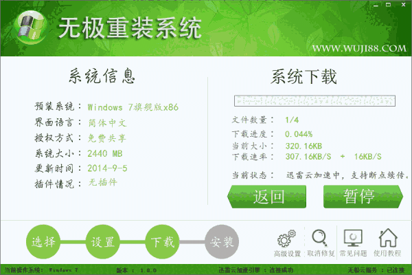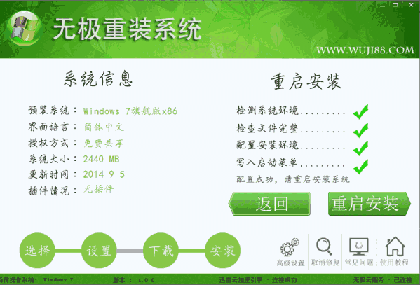 无极重装系统是基于GHOST11的系统重装工具。软件采用迅雷云加速引擎下载系统文件经过GHOST实现重装还原系统,整个过程无须人工操作。无极重装系统可在WINDOWS环境下安装XP,WIN7 32/64 WIN8.1 32/64 全部正版自动激活。高速,纯净,安全,稳定!自动化操作,无需光盘U盘,不用明白装机流程,也可实现一键重装系统。