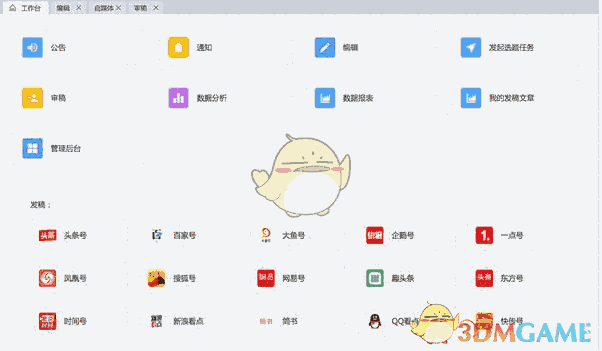 工作台包含公告、通知、编辑、审稿、发布选题任务、发稿、数据分析、我的发的发稿文章、管理后台、勤奋榜等功能。