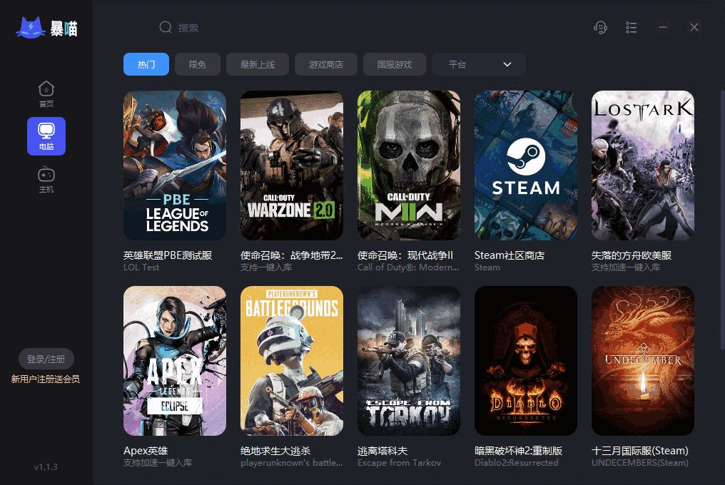 暴喵加速器电脑版是一款非常实用的游戏网络加速工具,软件界面设计简洁明了,操作起来非常简单,支持1000+款热门游戏加速,可以对Steam、Origin、战网等平台上的游戏进行加速,解决了玩家在游戏过程中遇到的卡顿、掉线、延迟高、无法登录等网络问题,满足不同场景游戏加速需求,有喜欢的小伙伴快来下载体验吧!