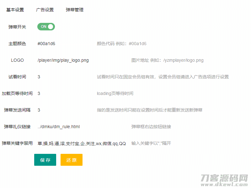 如何显示弹幕规则:player/index.php第 12 行删除【,.dmrules】就显示了