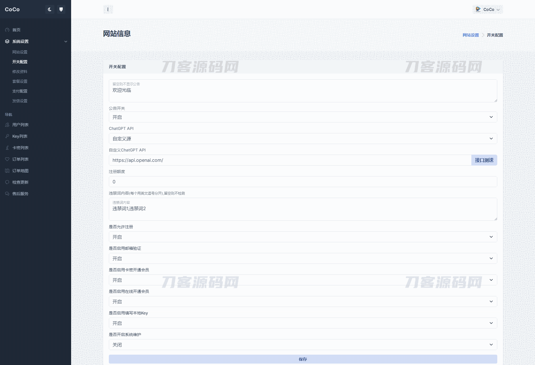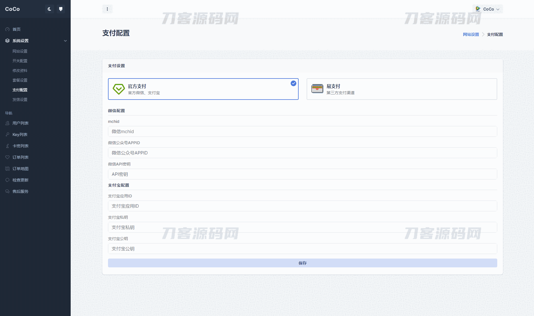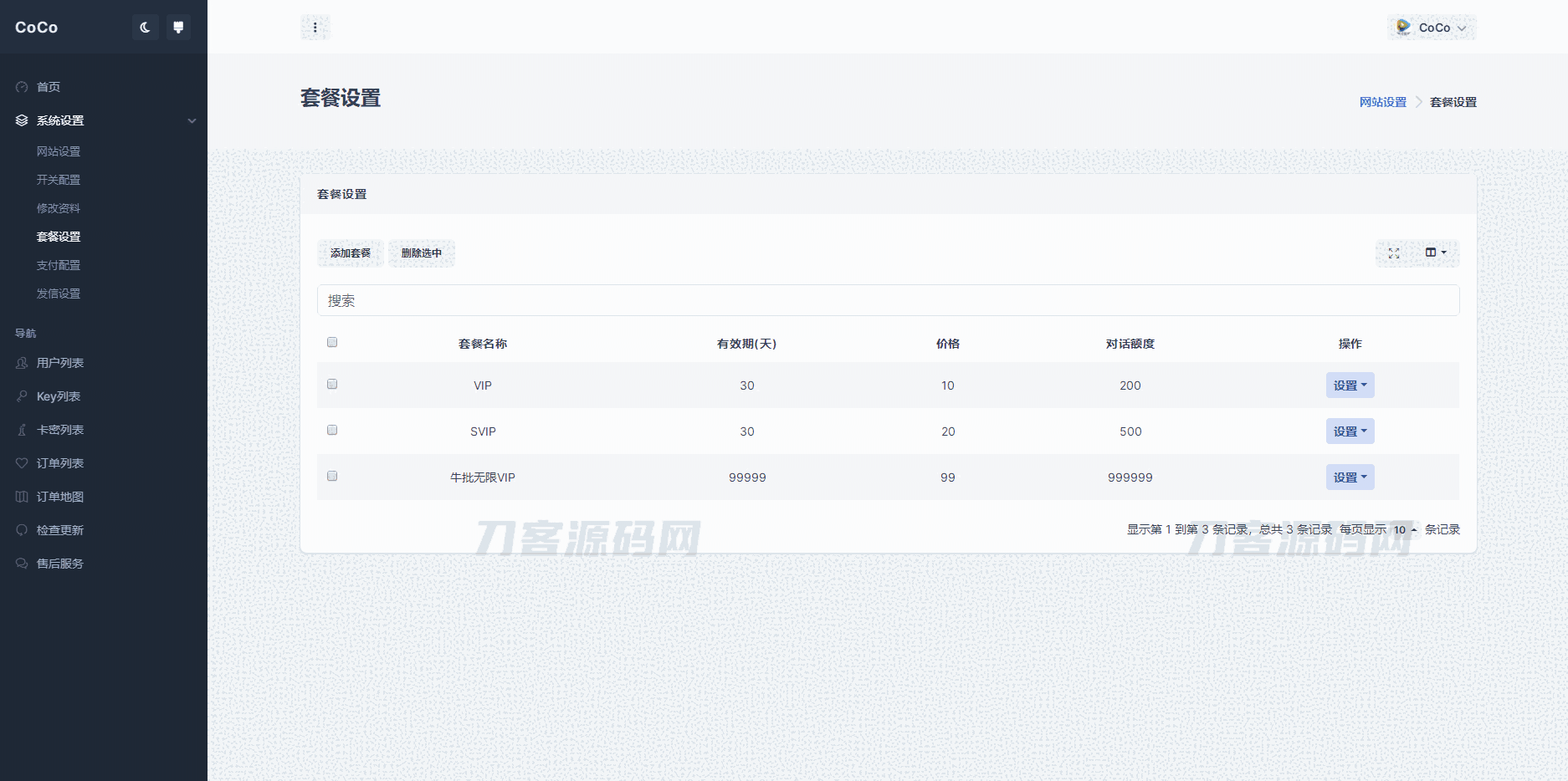 支持设置付费套餐,支持官方支付以及易支付,支持API接口更改,支持卡密