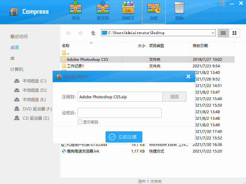 点击浏览,选择压缩路径,然后立即压缩就完成了。