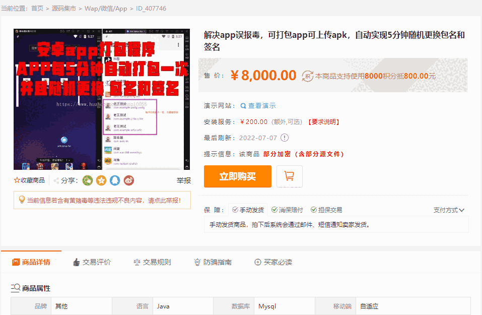 9080免费资源分享,PHP源码、网站源码、游戏源码、模板插件、软件工具、网络教程、为中国站长提供一站式源码下载 » 某站8000元APP封装系统 app误报毒app可上传 自动实现5分钟随机更换包名和签名+视频教程