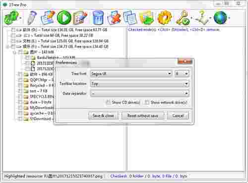 还为您提供了一些自定义界面的选项,如树字体、工具栏位置和数据分离器(分割每个资源的名称和大小),显示CD/NETS驱动器。在保存前,可以预览树字体和工具栏位置选项的效果。