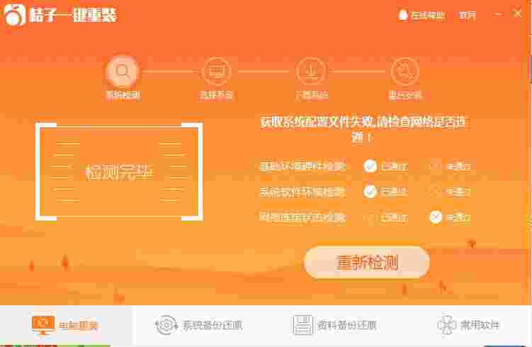 桔子一键重装系统是一款装机必备的系统辅助类工具软件,软件界面设计美观简洁,布局非常直观清晰,小白也可轻松操作。软件支持一键自动备份、重装系统和还原系统一站式服务,无需多余操作。