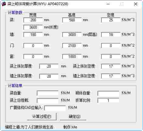 梁上砌体荷载计算器是一款专业的工程计算工具软件。软件可以根据使用者输入的已知条件数据包括梁、墙、门、窗的高宽和密度等,可以快速计算出梁自重、砌体自重、梁上总恒载、折算比例等数据结果,使用起来非常方便快捷。