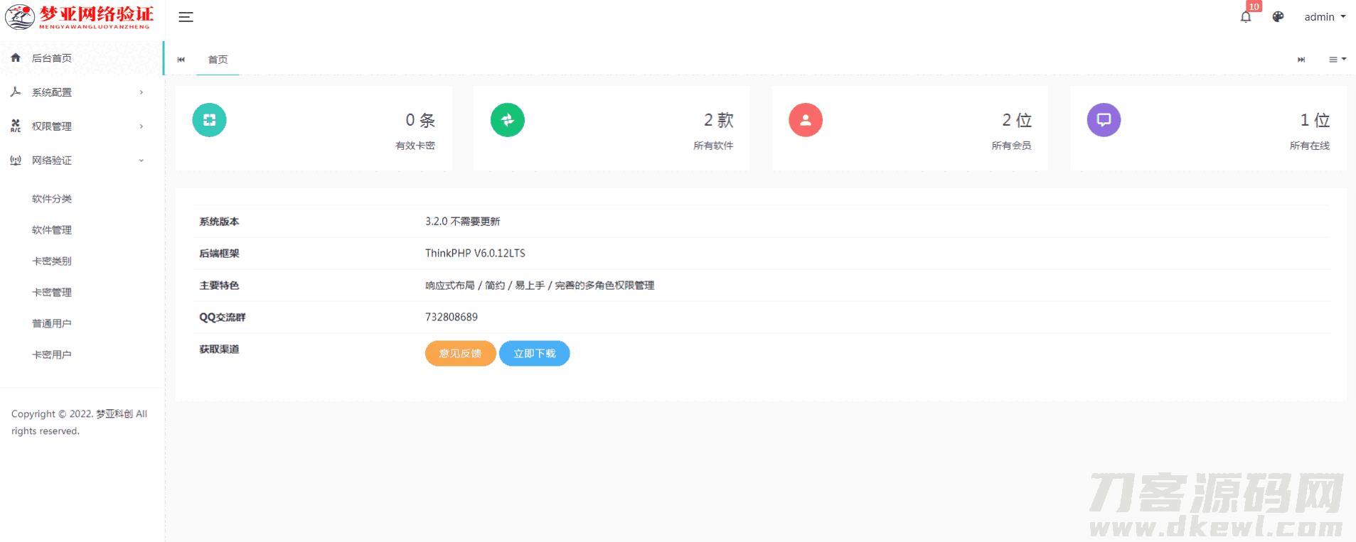 梦亚网络验证,基于thinkphp6.0+Bootstrap开发而成!后台管理系统是梦亚开发而成!网络验证功能也是梦亚开发而成!全量开源!