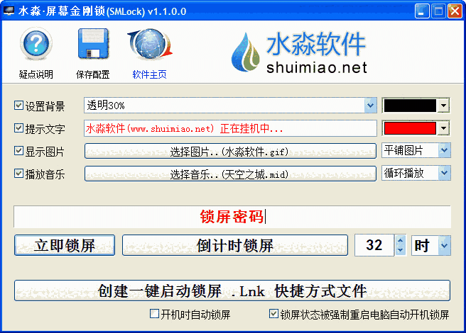 水淼屏幕金刚锁是一款专业的锁屏加密的工具软件。软件可以帮助使用者在不需要或不用电脑但不想关机的情况下为电脑进行加密锁屏,从而保护电脑。软件支持倒计时锁屏,使用者也可以自定义锁屏的背景、文字、图片和播放的音频文件。
