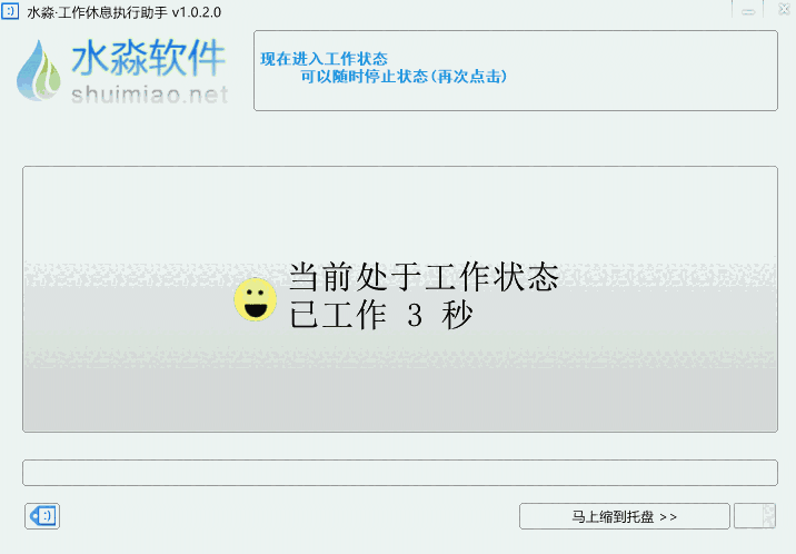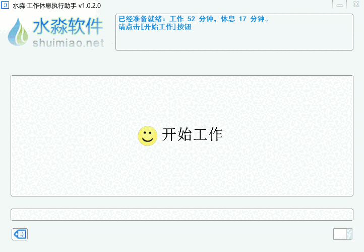 水淼工作休息执行助手是一款专业的时间提醒的工具软件,软件可以有4种状态提醒分别为工作、休息前、休息、工作前,十分方便快捷,界面简约,布局直观清晰,操作简单,极易上手,是一款不可多得的利器。