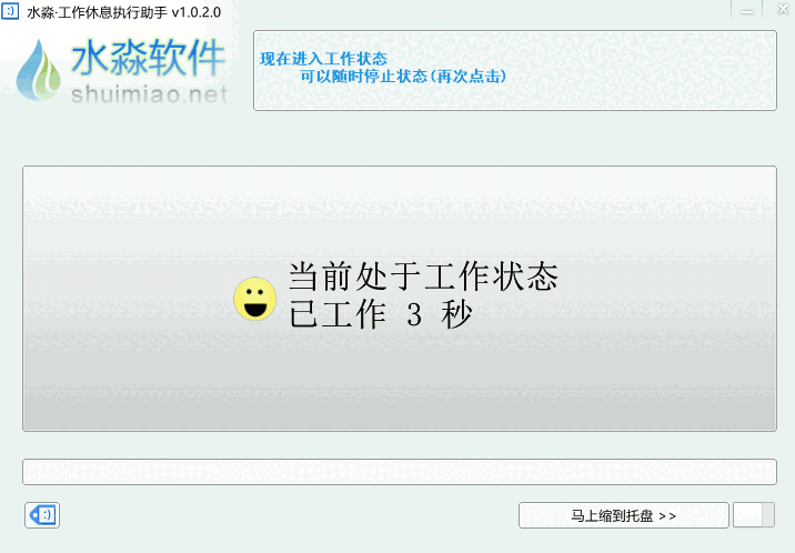 水淼工作休息执行助手正式版是一款在工作时间和休息时间的时候,帮助你自动进行计算时间的小工具。一般情况下大部分的人工作和休息时间都是混乱的,没有规律。这款软件能够让你在工作中达到最好的效率,休息的时候得到充足的休息。让你轻轻松松的过日子,身体健健康康的。这个软件的设计很人性化,当前状态信息的通知在文本显示框中显示,工作、休息前、休息、工作前的4种状态能够进行无缝切换。软件内置的微笑按钮帮助你,查看软件最新状态并且进行分享,软件内存特小,不会占据硬盘的很大空间。