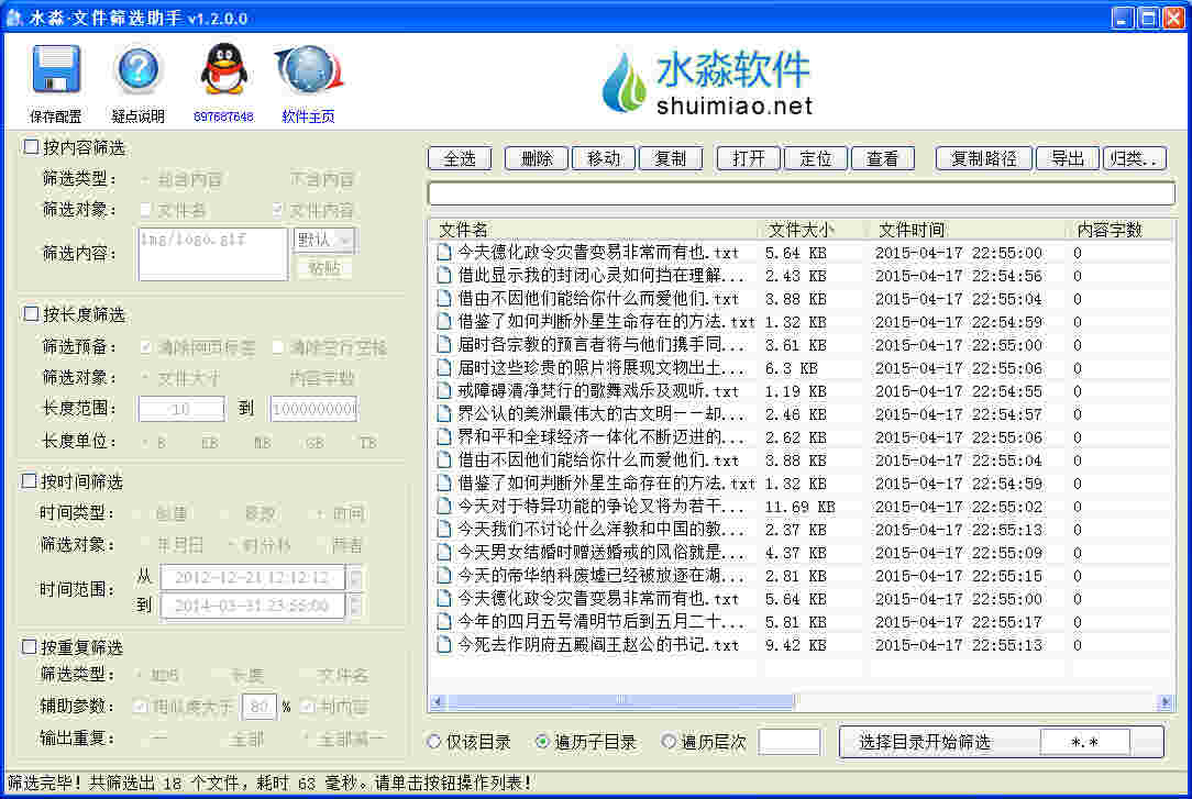 水淼文件筛选助手是一款专业的快速查找文件的软件工具,软件支持按照内容、长度、时间、重复程度四个方面筛选查找文件。非常方便快捷,软件界面简约,布局直观清晰。操作简单,容易上手,是一款十分实用的工具。