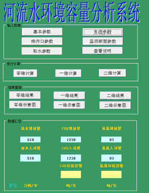 河流水环境容量分析系统是一款专业的河流水环境容量的分析工具软件。软件可以帮助使用者计算水库容量。支持零维计算、一维计算、二维计算三种计算模式,通过已知的数据如直流参数和排污口参数等来计算最终的结果。