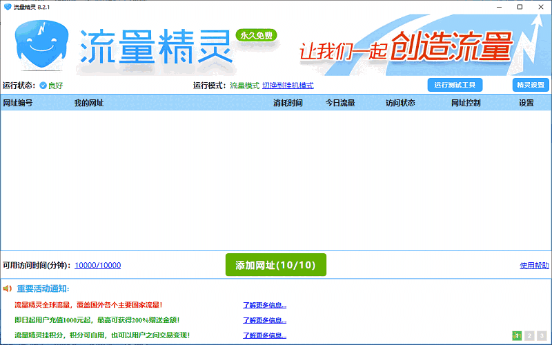 9、网址控制:显示网址在线状态,停止和开启流量,以及删除网址,只有网址在线时,才会获得流量;