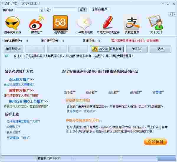 淘宝客推广大师是一款专门为淘宝客推广者量身定制的推广软件,包括网站推广,博客推广,论坛推广,留言推广等高效推广方法,可以给淘宝客推广者带来有效的成交客户。