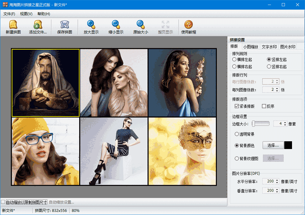 淘淘图片拼接之星电脑版是一款功能强大的图片拼接软件,软件界面简洁,操作简单易用,支持输出JPG、JPEG、PNG、GIF、BMP等常用图片格式,还拥有多种图像缩放重新取样插值算法,如最近相邻、两次线性、两次立方算法等,可以很好的满足我们对图片的拼接要求,欢迎有需要的小伙伴赶快下载体验吧!