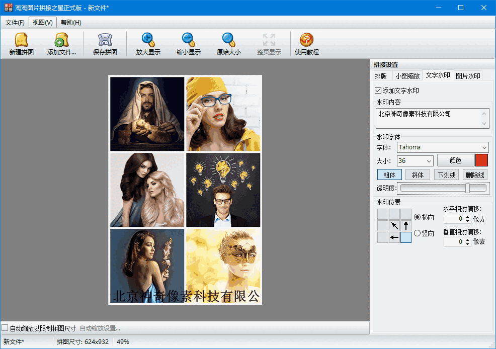 10、新增功能:支持“添加文字水印”的功能:可以在制作好的拼图上添加文件水印,支持半透明度,水印方向支持横向或竖向。