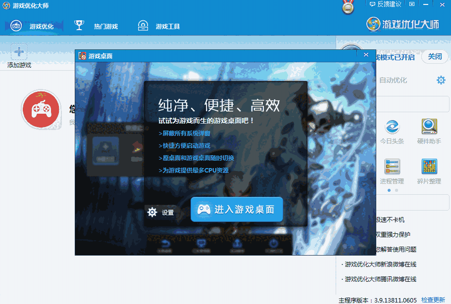 防打扰游戏桌面:游戏时切换到防打扰游戏桌面,屏蔽Win键弹窗、系统升级通知、防火墙通知等一切打扰,给用户最纯净的游戏环境。