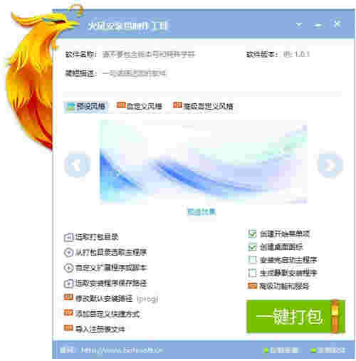 火凤安装包制作大师是一款专业的安装包的制作工具软件。软件可以帮助使用者制作完整的安装包,软件提供自定义背景图片、图标、界面大小等等功能帮助使用者可以对安装包高度自定义。软件的界面设计还是比较简洁直观的,方便小白用户上手使用。