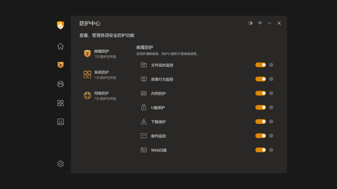 19项重要防护功能,有效防范病毒、木马、流氓软件、恶意网站等。文件实时监控:在程序运行前及时扫描,拦截病毒。