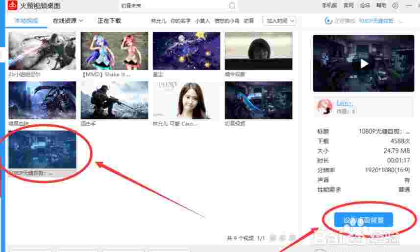 4、点击火萤视频桌面在本地视频,找到您要使用的视频,在页面右下角找到【设为桌面背景 】按钮,把这个视频设置成桌面背景。