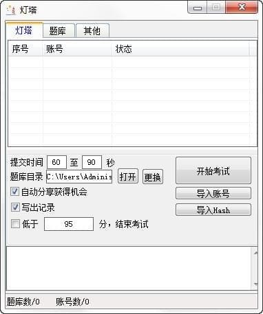 灯塔党建答题软件是一款专业的答题的辅助工具软件。使用者可以将答题的题库、账号、以及hash导入软件。在灯塔页面设定提交时间、题库目录,根据需求可以勾选写出记录、自动分享获得机会等选项。之后点击开始考试即可开始答题。