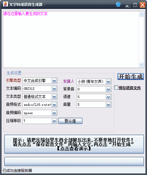 使用语音自动生成器转换语音之前可自定义引擎类型、文本编码、文本类型、音频格式、音频编码、压缩等级、发音人、背景音、语速、音量等选项。通过该软件制作免费的语音可以用作mc喊麦说话开场,也可以录制文字表白情书。生成的语音文件在软件运行目录!