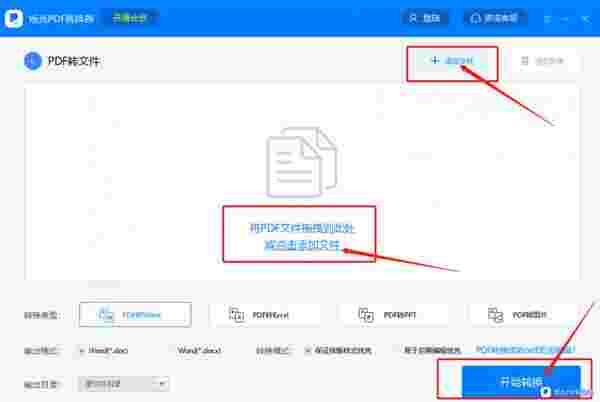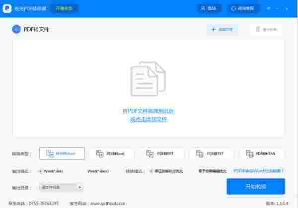 进入烁光PDF转换器的PDF转文件功能后就可以点击右上方的添加文件或者拖拽文件添加,然后选择烁光PDF转换器的PDF转Word功能,完成后点击右下方开始转换就可以了,开始转换之前可以选择烁光PDF转换器左下角输出目录选择输出路径,方便查找。