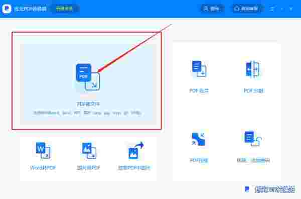 打开运行烁光PDF转换器,可以看到烁光PDF转换器的界面有几大模块的格式转换功能,我们点击左侧【PDF转文件】功能